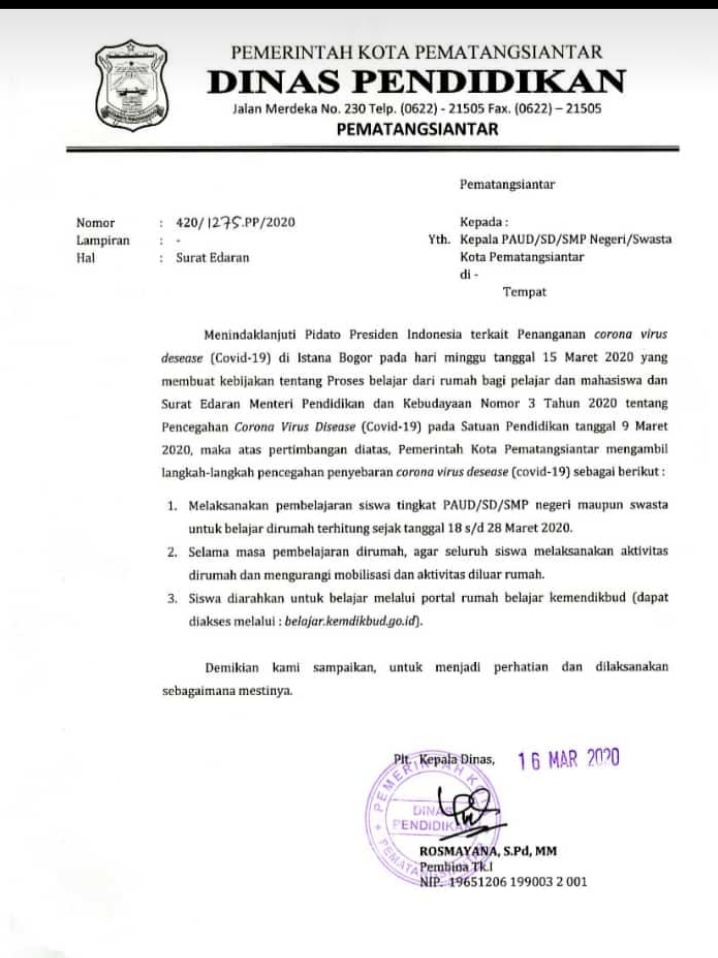 Demikian dikatakan Plt Kepala Dinas (Kadis) Pendidikan Kota Siantar, Rosmayana Marpaung kepada awak media, Senin (16/03/2020), lewat panggilan suara whatsapp (WA). Libur diberlakukan untuk siswa SMP, SD, TK maupun PAUD, Untuk mengurangi tingkat penyebaran virus corona.