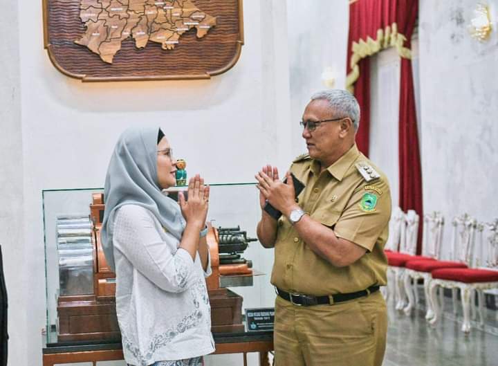 Bupati Indramayu Nina Agustina didampingi Sekretaris Daerah (Sekda) Indramayu Rinto Waluyo menyambut kunjungan Bupati Kuningan H. Acep Purnama bersama rombongan, di Pendopo Indramayu, Selasa (11/4/2023).