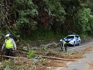 Personel Satlantas Polres Pakpak Bharat melakukan evakuasi pohon tumbang yang menutup jalan nasional Medan - Subulussalam tepatnya di gerbang perbatasan wilayah hukum Polres Pakpak Bharat - Polres Dairi, Kamis (7/5/2024) sekira pukul 06.00 Wih.